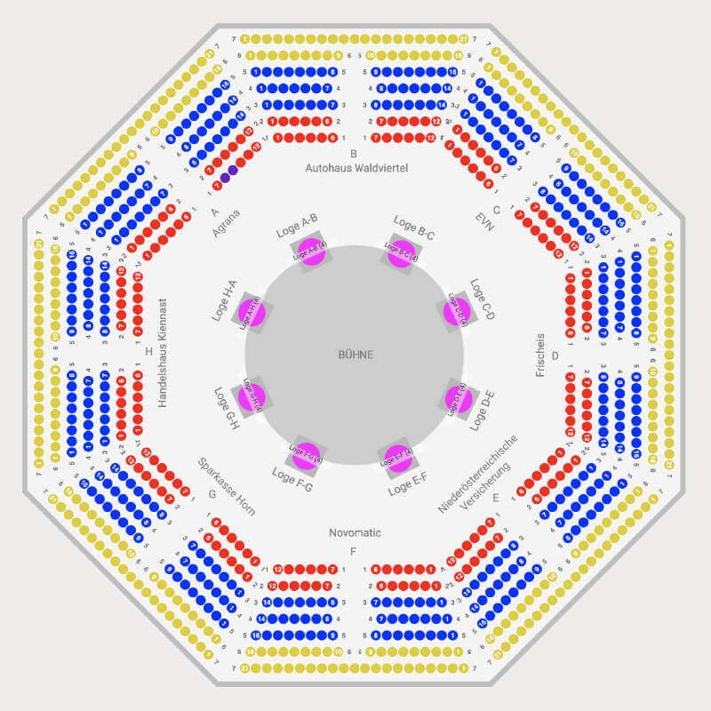 *Aufgrund des Bühnenbilds kann es zu leicht abweichenden Standorten der Logen kommen. Der Saalplan unseres Theaterzelts dient hier als reines Symbolbild.